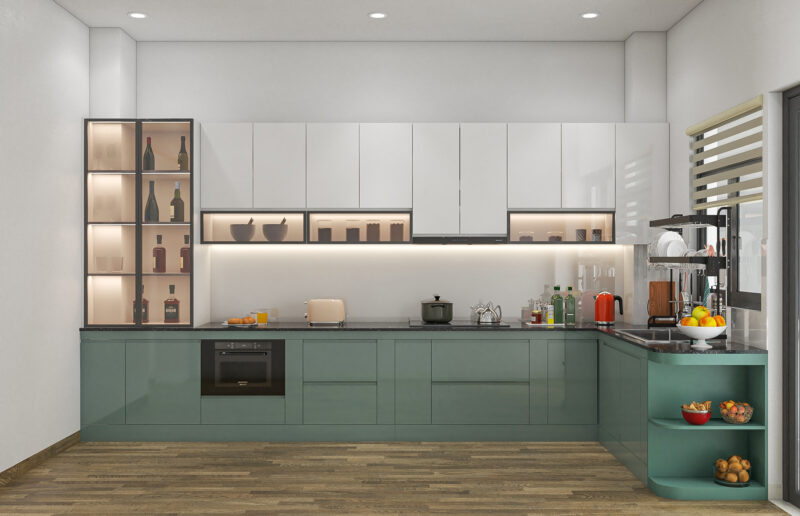 - Màu sắc chủ đạo: Sự kết hợp giữa tủ bếp dưới màu xanh ngọc bích và tủ bếp trên màu Trắng bóng .Sự phối hợp này mang lại cảm giác tươi mới, nhẹ nhàng, và sang trọng theo xu hướng nội thất Bắc Âu và hiện đại.