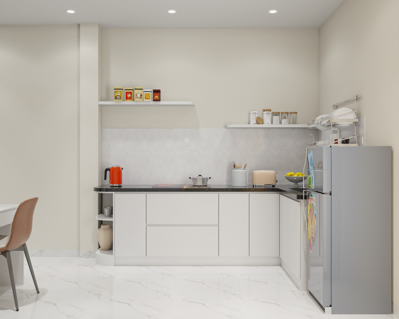 - Khu vực lưu trữ thông minh: Hai kệ mở đơn giản giúp trưng bày các vật dụng trang trí, gia vị, hoặc đồ dùng nhà bếp thường xuyên. Đây là cách tuyệt vời để tăng tính thẩm mỹ và dễ dàng lấy đồ.