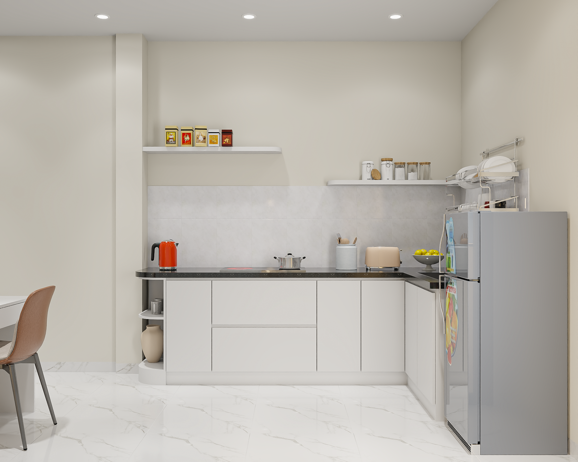 - Thiết kế phòng bếp hiện đại, tinh tế giúp tận dụng tối đa không gian nhỏ: Tường và tủ bếp được sử dụng tone màu trắng và kem giúp mở rộng không gian và tạo cảm giác sạch sẽ, thoáng đãng.
