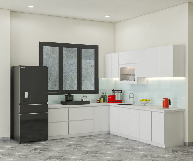 - Không gian bếp hiện đại, tối giản và sang trọng: Thiết kế tủ bếp hình chữ L mang đến không gian bếp được tối ưu diện tích, tiện lợi, sang trọng và tinh tế