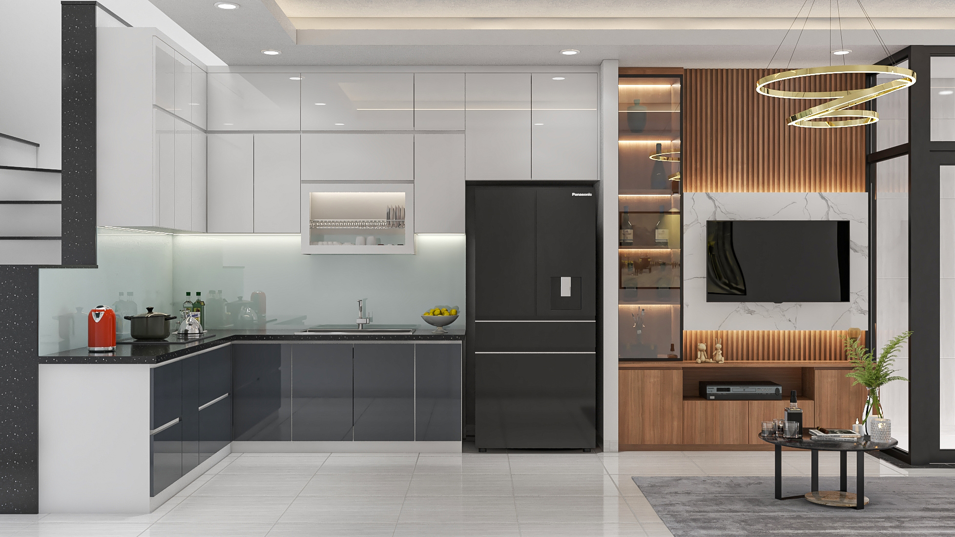 - Thiết kế tủ bếp hình chữ L tinh gọn, phù hợp cho nhà phố và chung cư