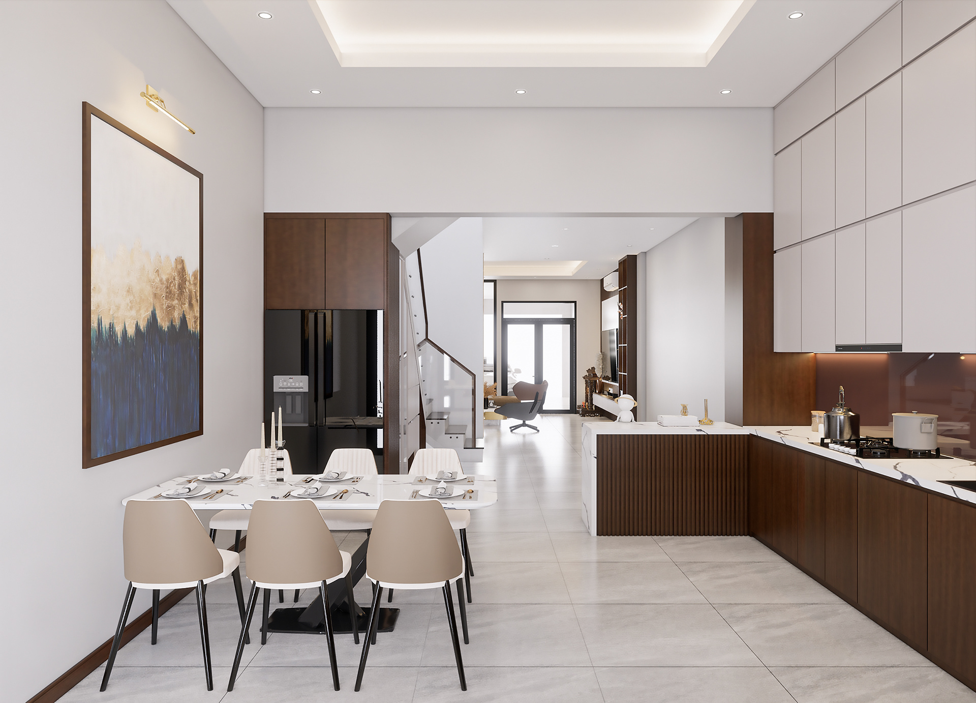 - Không gian bếp được thiết kế theo phong cách hiện đại với sự kết hợp giữa khu vực bếp chức năng và phòng ăn trang nhã tạo nên một không gian sống ấm cúng và tiện nghi.
