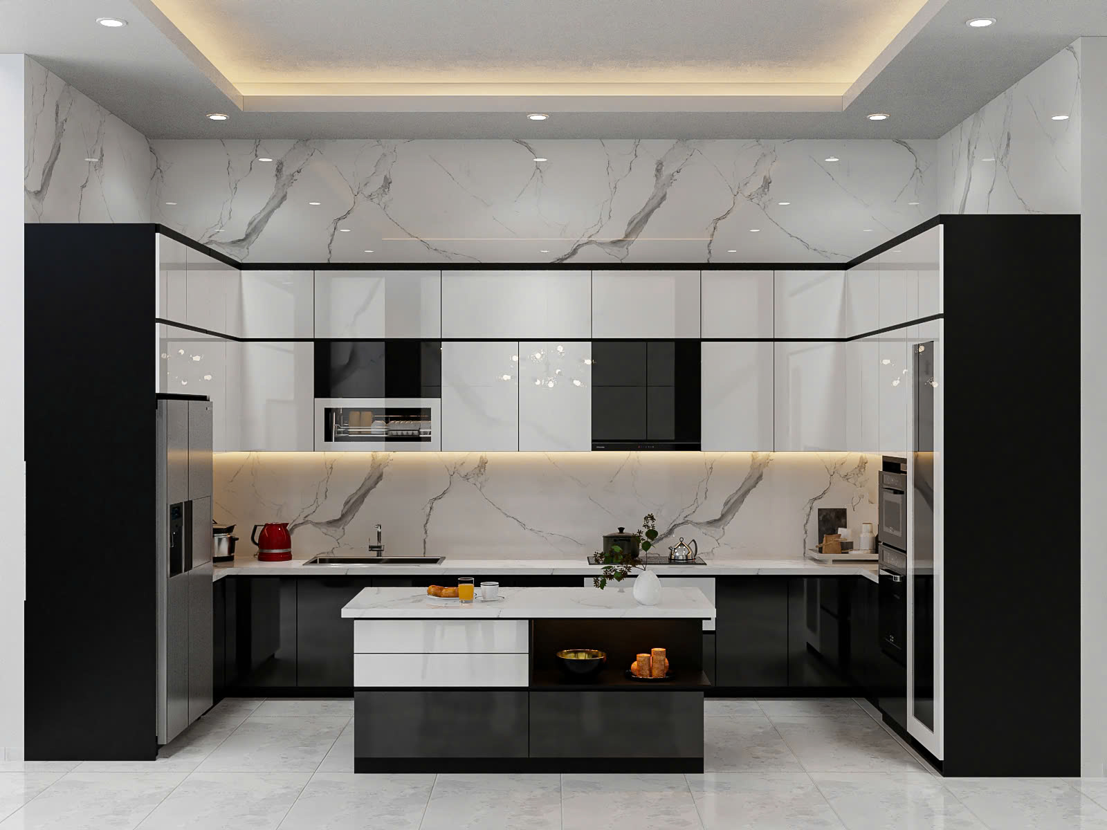 - Màu sắc chủ đạo: Sự đối lập giữa hai gam màu kinh điển đen và trắng tạo nên chiều sâu và sự sang trọng cho căn bếp nhà bạn.