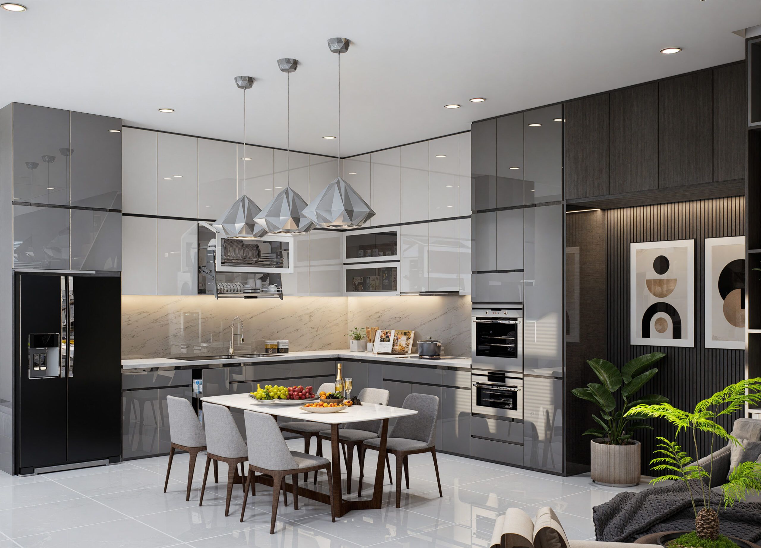 - Tủ bếp được làm từ vật liệu Acrylic bóng gương kết hợp Laminate màu xám đậm tạo hiệu ứng phản chiếu giúp căn bếp trở nên rộng rãi hơn