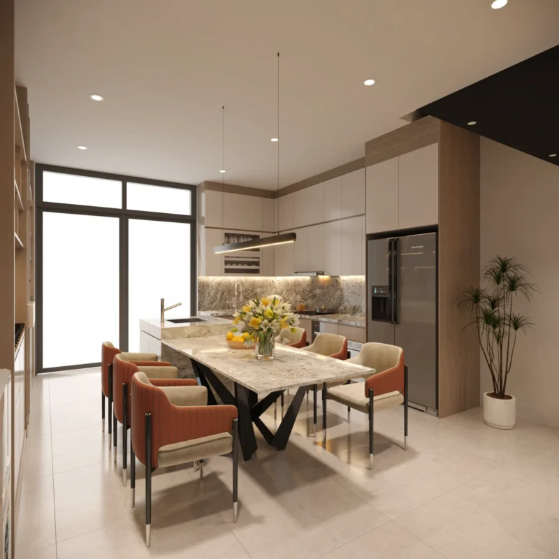 - Bàn ăn được thiết kế độc đáo: Bàn ăn được làm bằng đá marble cao cấp đi kèm ghế tựa êm ái phù hợp cho các bữa cơm gia đình ấm cúng