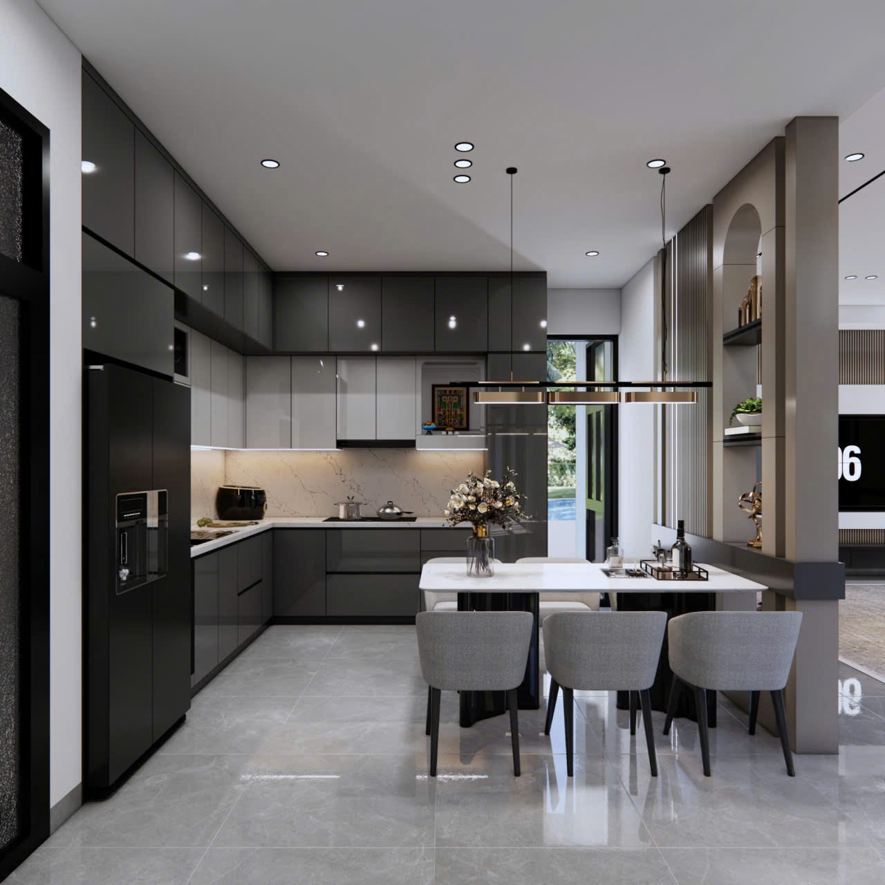 - Phòng bếp này nổi bật với phong cách thiết kế hiện đại, sang trọng và tối giản phù hợp cho không gian sống hiện đại đẳng cấp.