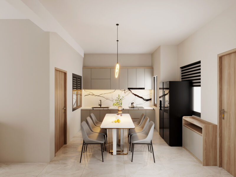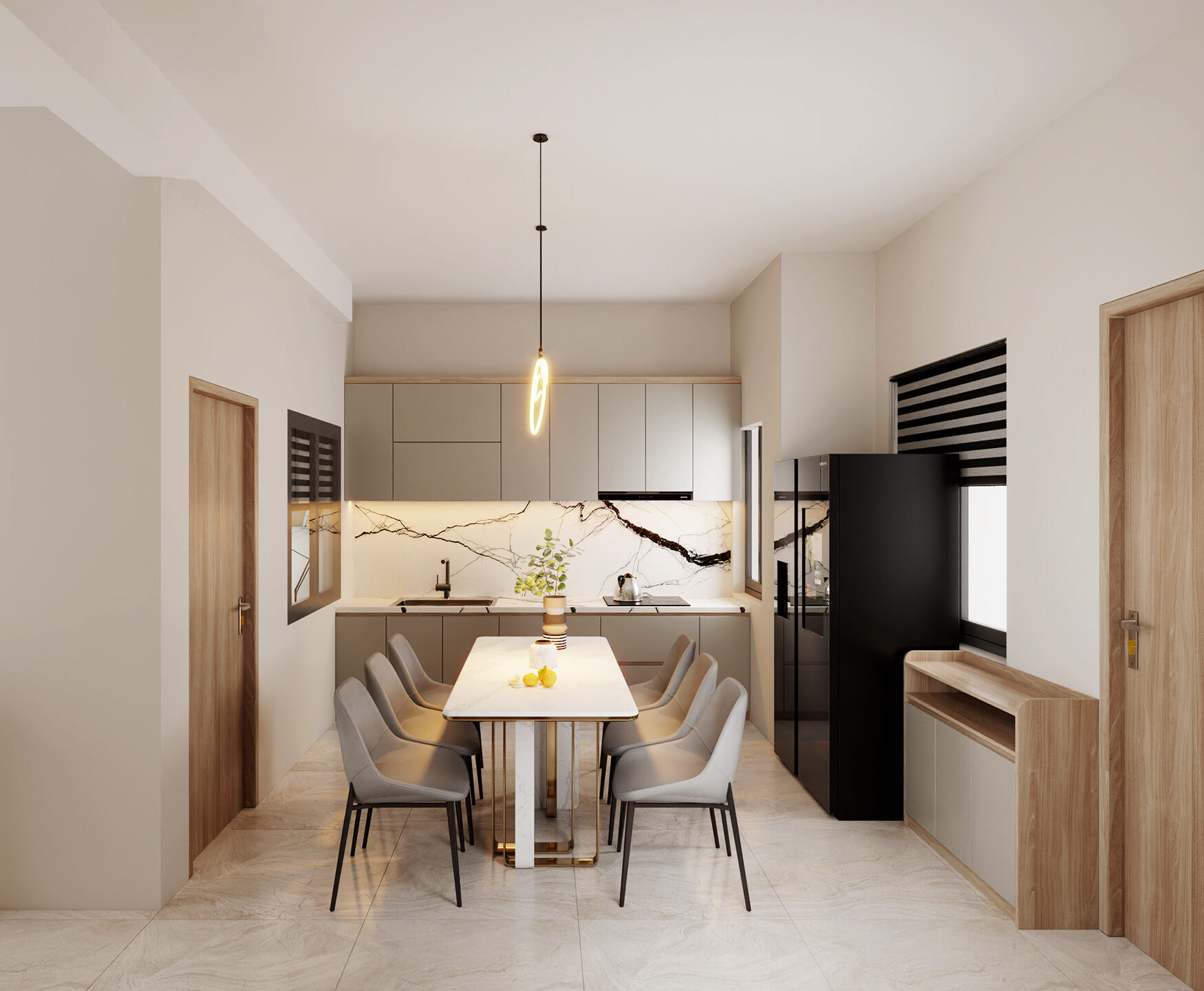 - Hệ thống ánh sáng hiện đại với đèn LED âm trần và đèn treo trang trí giúp phòng bếp sáng rõ, ấm cúng và tiện nghi