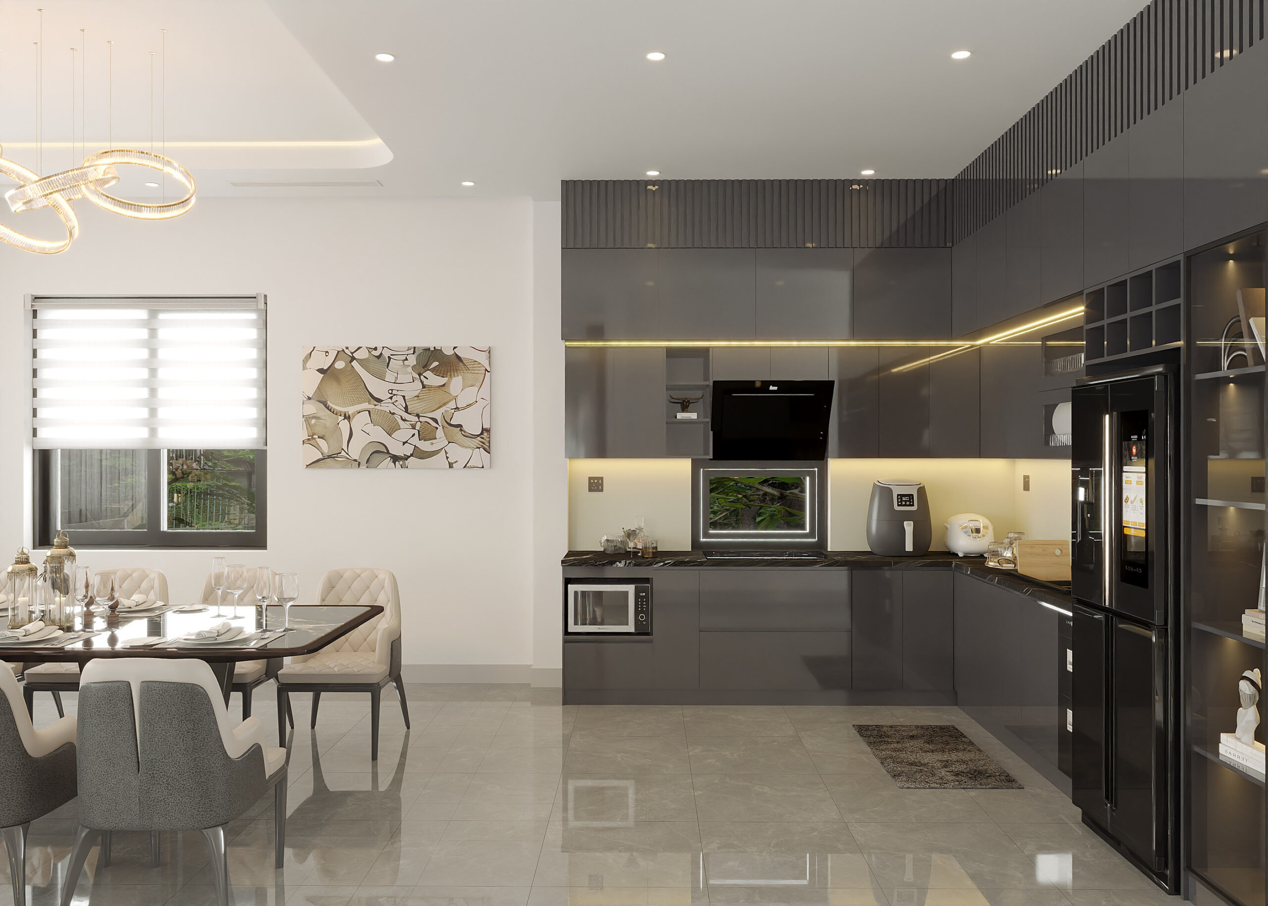 - Phòng bếp thiết kế mỡ kết hợp bàn ăn rộng rãi tạo không gian ấm cúng và thân thiện cho mọi gia đình
