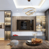 - Tivi được lắp âm tường tạo bố cục gọn gàng đồng thời là trung tâm thu hút mọi mọi ánh nhìn trong phòng khách.