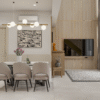 - Màn hình TV lớn đặt ngay trung tâm, dễ dàng tiếp cận và phù hợp cho giải trí cùng gia đình. Không gian còn điểm xuyến bằng các vật trang trí nhỏ gọn, như bình hoa, sách và tượng nhỏ tạo sự sinh động và cá tính cho căn phòng. Tủ lạnh và các thiết bị trong bếp gần kề, thể hiện sự tiện nghi và hợp lý trong bố trí không gian mở.