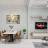 - Phòng khách sử dụng bàn ăn bằng đá màu trắng sáng, kết hợp với ghế tựa bằng da màu nâu ấm, tạo cảm giác sang trọng và dễ chịu. Tường và tủ kệ màu trung tính, nổi bật với các chi tiết trang trí màu sắc nhẹ nhàng.