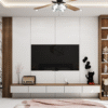 - Điểm nhấn chính của phòng khách này là kệ tủ tivi dạng module được thiết kế tối giản – phối gỗ sơn trắng hài hoà cùng với những đường kẻ sóc lam gỗ thẳng đứng giúp tăng chiều cao và chiều sâu cho không gian ấm cúng, thư giãn và đầy tinh tế.