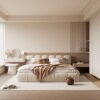 Hệ tủ kịch trần: Tận dụng tối đa chiều cao của căn phòng để làm kho lưu trữ, giúp không gian luôn gọn gàng. Tủ được làm từ gỗ công nghiệp MDF lõi xanh phủ melamine chống trầy xước tốt, dễ vệ sinh và đa dạng màu sắc.