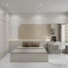 Điểm nhấn đầu tiên của căn phòng chính là bảng màu trung tính với tông trắng kem và nâu gỗ sáng. Sự kết hợp này không chỉ tạo cảm giác không gian rộng rãi, thoáng đãng hơn mà còn mang lại sự thư thái, dễ chịu cho chủ nhân sau một ngày dài làm việc.