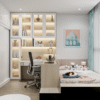 - Bàn làm việc được đặt cạnh cửa sổ để đoán ánh sáng tự nhiên, tích hợp cùng hệ kệ trang trí có đèn LED âm tủ giúp không gian trở nên lung linh và đầy cảm hứng