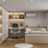 Mẫu thiết kế phòng ngủ hiện đại này được lấy cảm hứng từ phong cách Scandinavian kết hợp tối giản, mang đến vẻ đẹp ấm áp, tinh tế và tiện nghi. Với diện tích chỉ khoảng 14m², không gian vẫn được bố trí đầy đủ công năng, lý tưởng cho phòng ngủ trẻ em, phòng phụ hoặc phòng cá nhân trong chung cư.