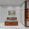 - Hệ tủ quần áo âm tường tích hợp kệ trang trí mở, giúp tối ưu hóa diện tích và tạo không gian mở thoáng đãng.