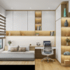- Góc làm việc nhỏ gọn với bàn học tích hợp cùng ghế xoay ergonomic, phù hợp cho việc học tập hoặc làm việc tại nhà.