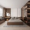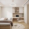 Trong thiết kế nội thất hiện đại, việc tận dụng từng mét vuông là yếu tố quan trọng. Mẫu phòng ngủ trong hình minh họa là ví dụ điển hình: giường ngủ, bàn làm việc và tủ lưu trữ được bố trí liền mạch, tạo nên một không gian gọn gàng nhưng vẫn đầy đủ tiện nghi.