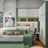 - Bộ phòng ngủ với hệ tủ quần áo lớn, có màu trắng và gỗ tự nhiên, giúp lưu trữ đồ đạc rộng rãi và gọn gàng.