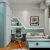 - Gỗ công nghiệp được sử dụng cho sàn nhà, các nội thất như bàn học, tủ và giường, mang lại vẻ đẹp tự nhiên, ấm cúng.