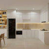 - Hệ tủ bếp chữ L giúp tối ưu diện tích và mang lại sự gọn gàng, ngăn nắp cho không gian bếp. Mặt bàn bếp sử dụng đá tự nhiên màu đen vân mây, vừa bền bỉ, dễ vệ sinh, vừa tạo điểm nhấn nổi bật cho khu vực nấu nướng. Kết hợp hệ thống đèn LED âm trần và đèn trang trí giúp không gian luôn sáng sủa, tạo cảm giác ấm cúng, thoải mái khi sử dụng