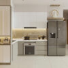 Tủ bếp được thiết kế theo phong cách hiện đại, sử dụng gam màu trung tính sang trọng