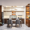 - Phòng bếp được thiết kế liền kế với phòng khách với tủ trang trí kết hợp đèn LED tạo một tổng thể không gian hiện đại, ấm cúng và mang tính thẩm mỹ cao