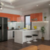 - Tủ bếp được thiết kế theo hình dạng chữ L giúp tiết kiệm diện tích và thuận tiện trong việc nấu nướng.