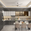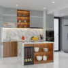 - Mẫu phòng bếp này nổi bật với phong cách hiện đại, sử dụng gam màu trung tính như trắng, xám, gỗ tự nhiên mang lại cảm giác sạch sẽ, rộng rãi và thoáng mát.
