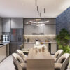 - Thiết kế nội thất phòng bếp này nổi bật bởi tone màu xám tối tinh tế, kết hợp đường nét tối giản. Không gian bếp vừa sang trọng vừa mang đến sự gọn gàng, sạch sẽ và tiện nghi cho một gia đình hiện đại