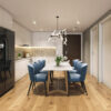 - Bàn ăn hình chữ nhật nhỏ gọn, đặt ngay trung tâm phòng bếp, phù hợp cho gia đình từ 4-6 người. Trên bàn trang trí một bình hoa tinh tế, mang lại cảm giác tươi mới và sinh động cho không gian. Các ghế ăn có kiểu dáng đơn giản, ghế tựa nhẹ nhàng, mang lại cảm giác thoải mái.