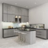 - Bố cục thông minh: Hệ tủ bếp được thiết kế theo dạng chữ L kết hợp với đảo bếp rất phù hợp cho các căn hộ chung cư có diện tích vừa. Đảo bếp làm bàn ăn nhanh góp phần tăng tính tiện dụng và mở rộng cho không gian lưu trữ